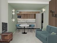 Un ambiente compatto progettato come stanza polifunzionale, con una cucina su misura che nasconde vani tecnici e include un tavolo snack salvaspazio. L'atmosfera, accogliente e dal carattere maschile, è caratterizzata da finiture in legno di noce e metallo nero, arricchita da tocchi di verde salvia.
